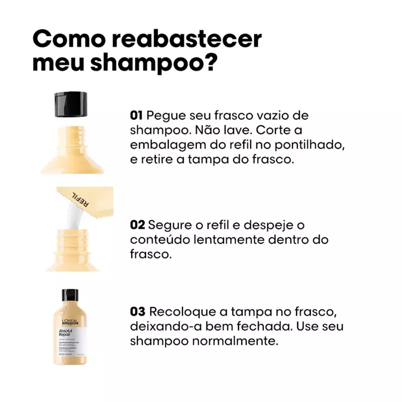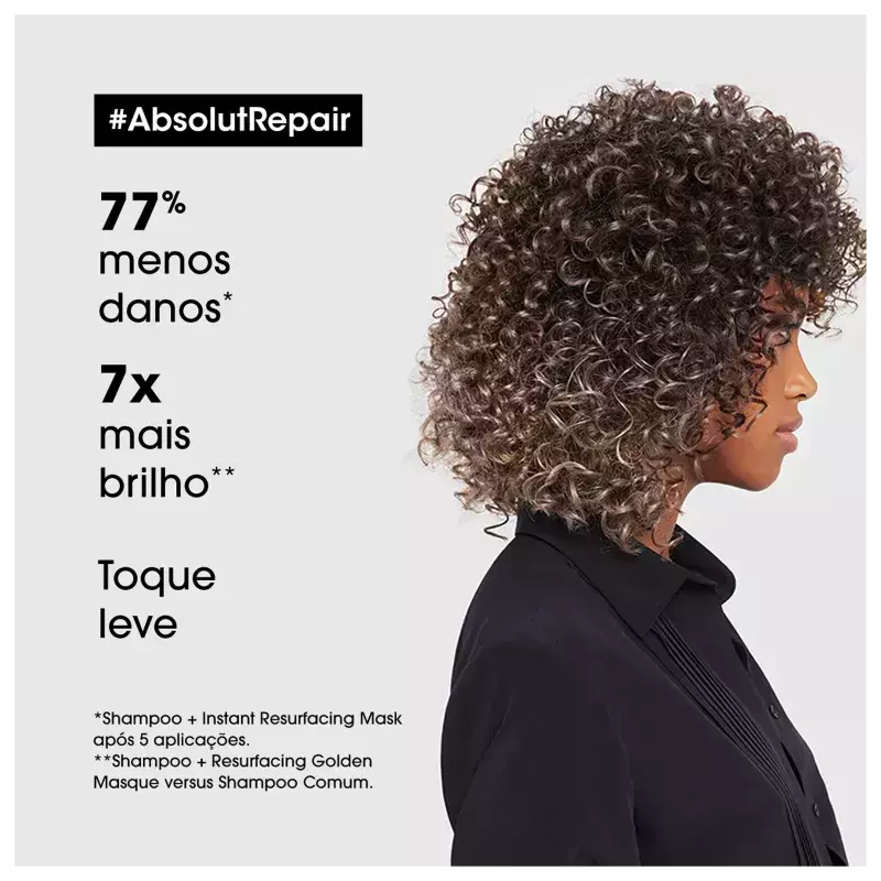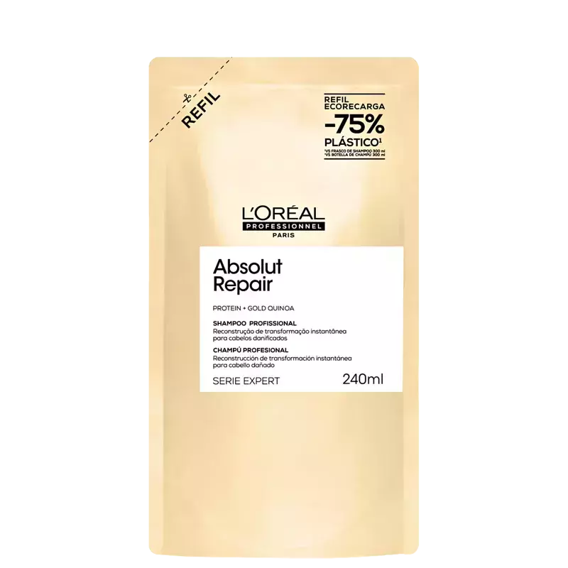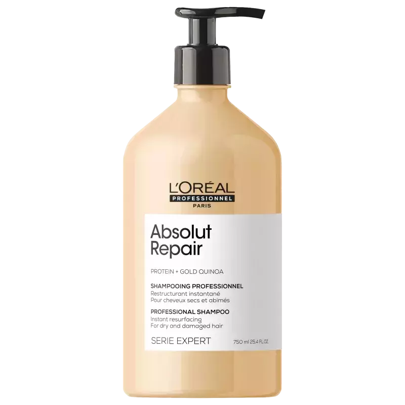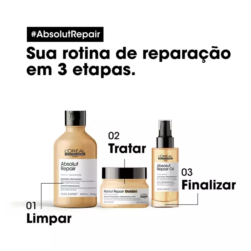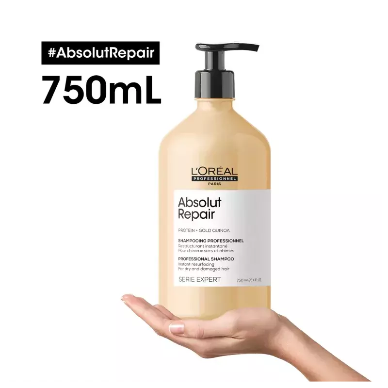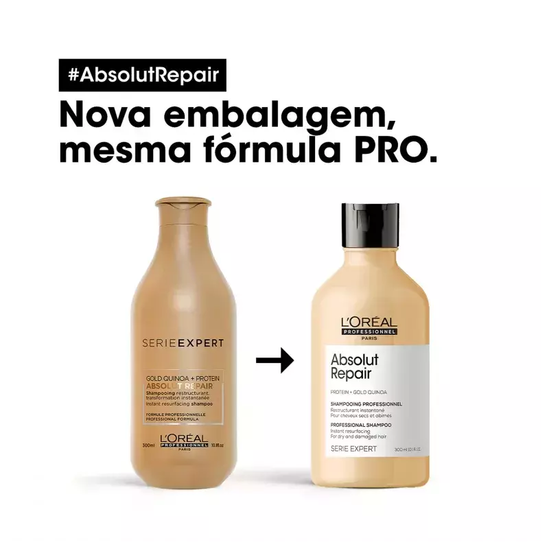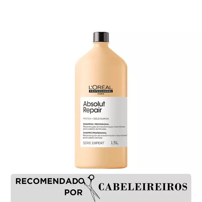 Shampoo de tratamento da linha Absolut Repair Gold Quinoa contém quinoa dourada e proteína de trigo. A fórmula profissional repara e nutre instantaneamente os fios e proporciona um cabelo mais leve, reparado, brilhante e suave sem deixar o cabelo pesado ou rígido.